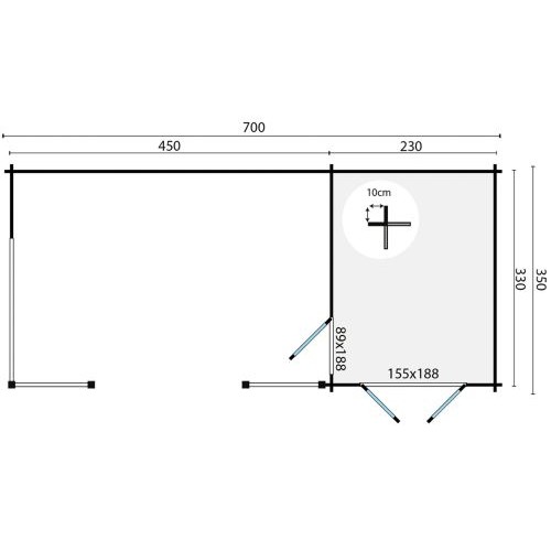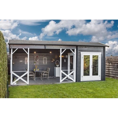 Blokhut Kukka 250 + 450 x 350 cm is een fraai vorm gegeven blokhut. De Blokhut Kukka 250 + 450 x 350 cm heeft een mooi open uiterlijk en heeft de ruimte voor een mooi ruim terras maar ook de benodigde bergruimte.