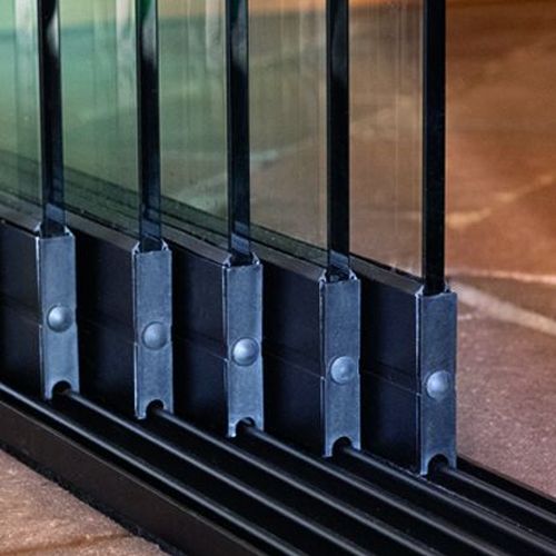 Glazen schuifwand zwart 5-sporig tot 482 cm breed 233-237 cm hoog, wordt geleverd inclusief:
